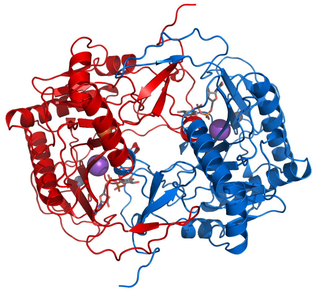Cartoon diagram of a dimer of Escherichia coli galactose-1-phosphate uridylyltransferase (GALT) in complex with UDP-galactose (stick models). Potassium, zinc, and iron ions are visible as purple, gray, and bronze-colored spheres respectively..