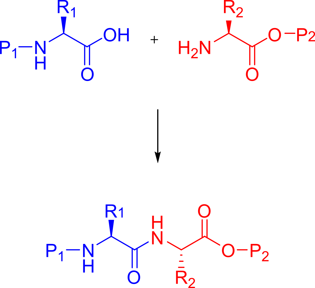 Coupling of two amino acids in solution. The unprotected amine of one reacts with the unprotected carboxylic acid group of the other to form a peptide bond. In this example, the second reactive group (amine/acid) in each of the starting materials bears a protecting group.