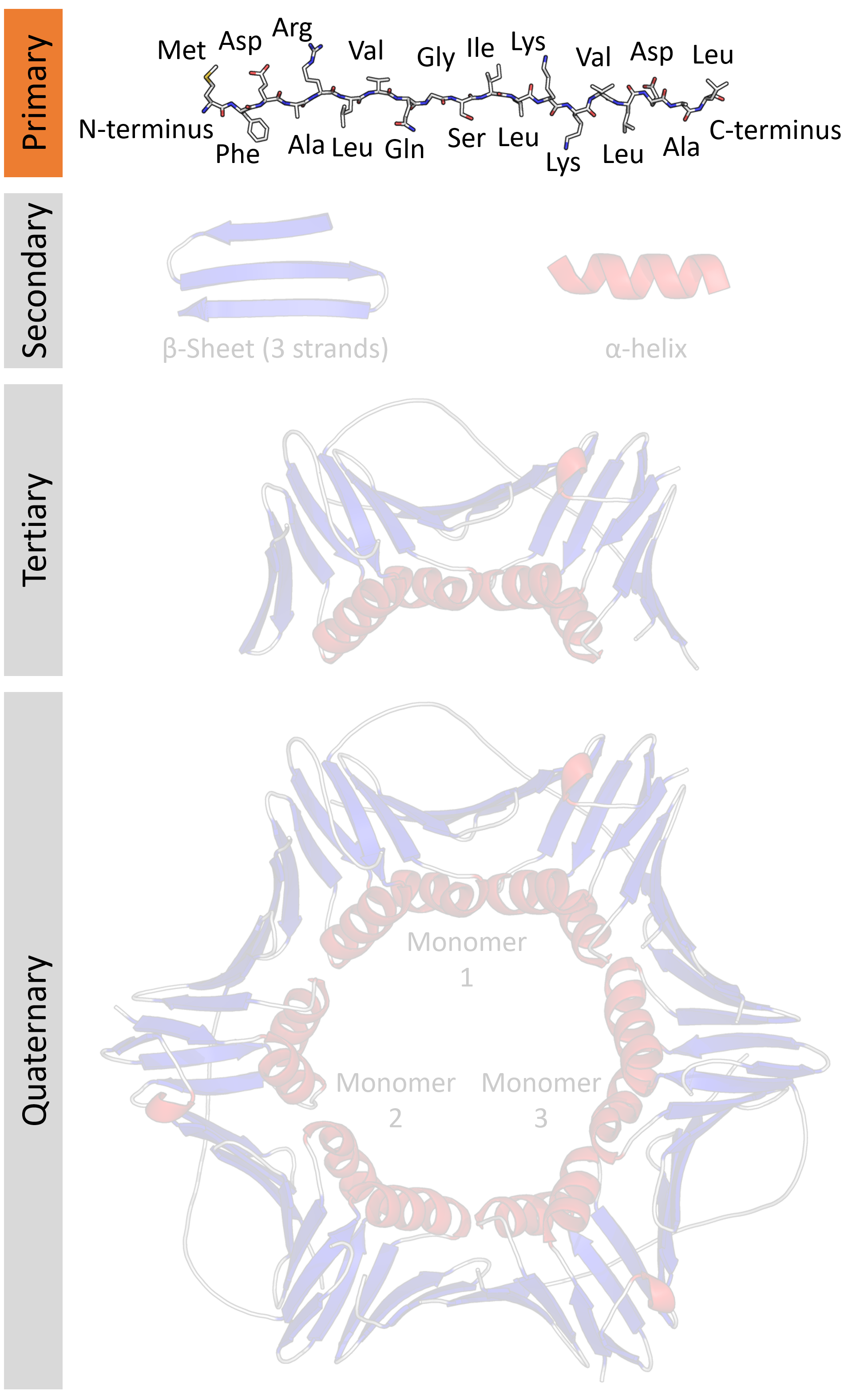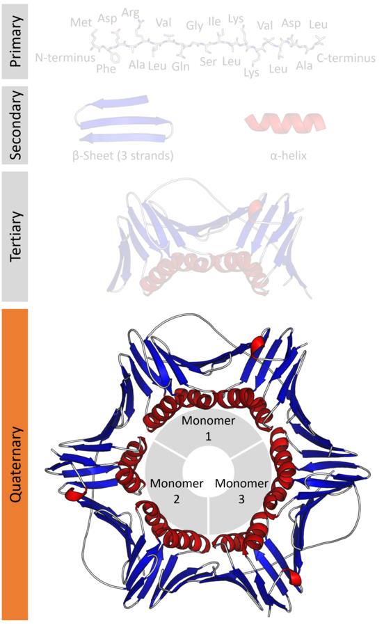 Many proteins are actually assemblies of multiple polypeptide chains. The quaternary structure refers to the number and arrangement of the protein subunits with respect to one another. Examples of proteins with quaternary structure include hemoglobin,DNA polymerase, and ion channels.(W)
