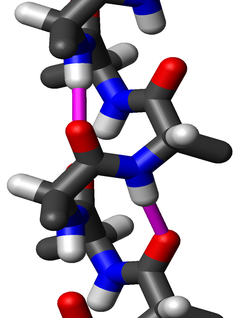310 helix Side view of a 310-helix of alanine residues in atomic detail. Two hydrogen bonds to the same peptide group are highlighted in magenta; the oxygen-hydrogen distance is 1.83 Å (183 pm). The protein chain runs upwards, i.e., its N-terminus is at the bottom and its C-terminus at the top of the figure. Note that the sidechains point slightly downwards, i.e., towards the N-terminus. (W)