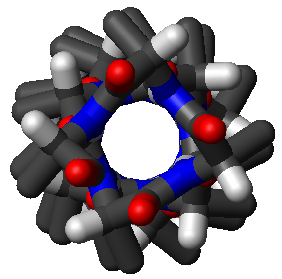Top view of the same 310 helix helix shown to the right. Three carbonyl groups are pointing upwards towards the viewer, spaced roughly 120° apart on the circle, corresponding to 3.0 amino-acid residues per turn of the helix. (W)