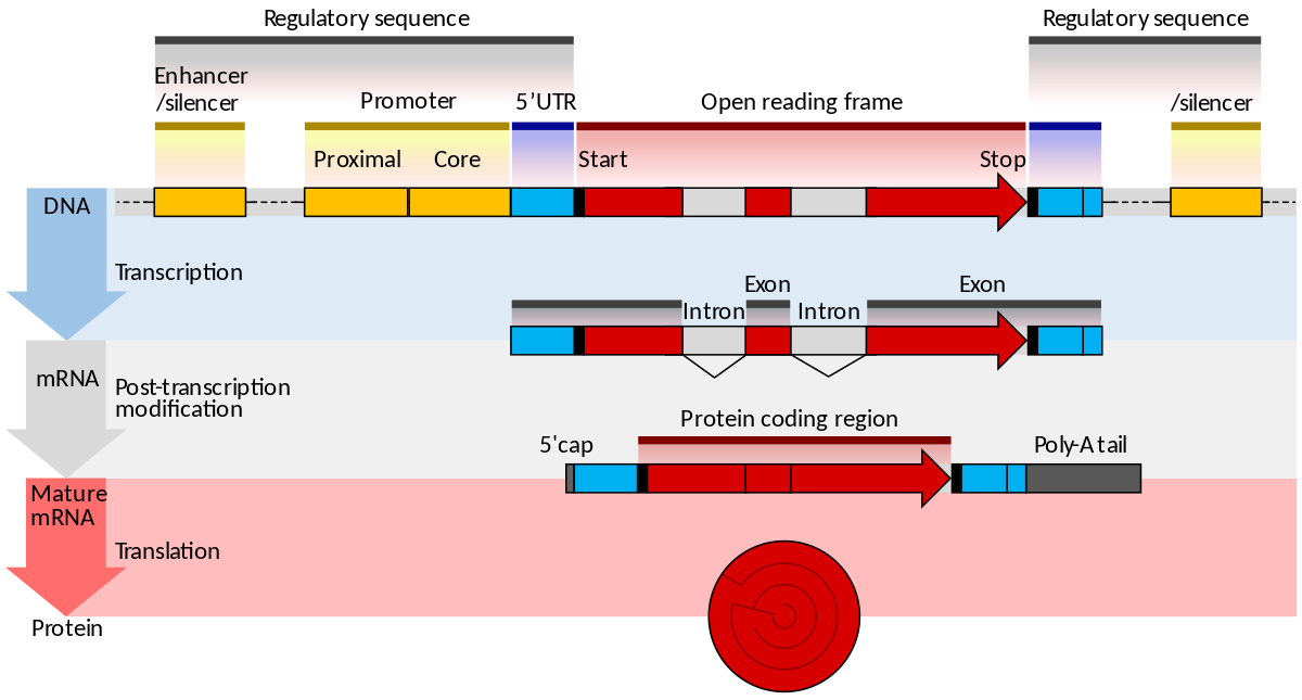 In genetics, an operon is a functioning unit of DNA containing a cluster of genes under the control of a single promoter. The genes are transcribed together into an mRNA strand and either translated together in the cytoplasm, or undergo splicing to create monocistronic mRNAs that are translated separately, i.e. several strands of mRNA that each encode a single gene product. The result of this is that the genes contained in the operon are either expressed together or not at all. Several genes must be co-transcribed to define an operon.