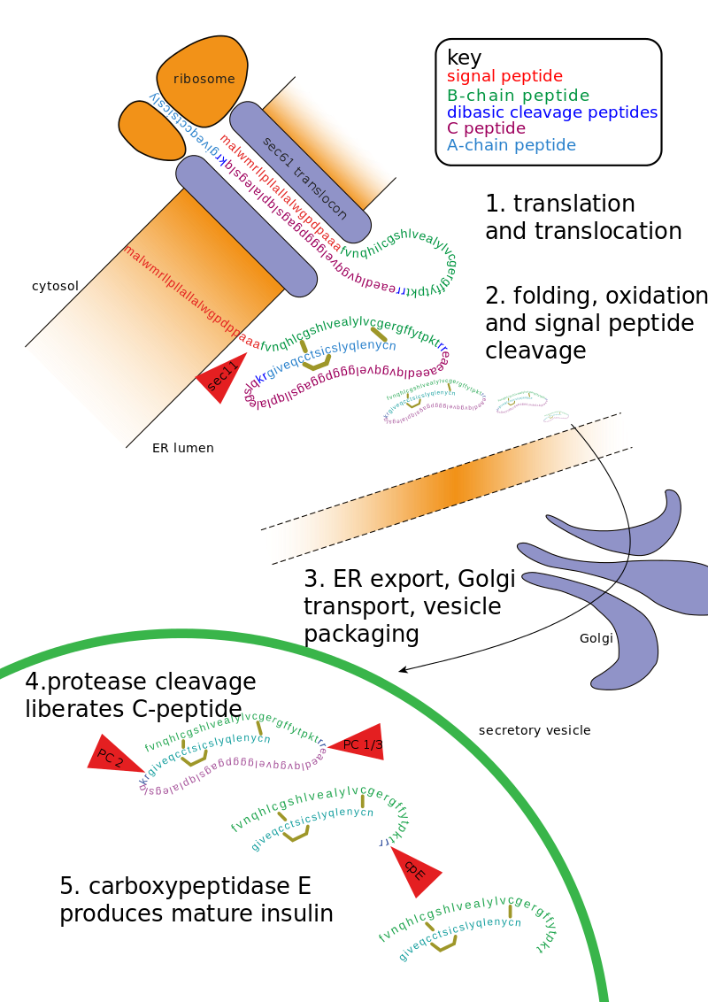 Protein synthesis can be divided broadly into two phases - transcription and translation. During transcription, a section of DNA encoding a protein, known as a gene, is converted into a template molecule called messenger RNA. This conversion is carried out by enzymes, known as RNA polymerases, in the nucleus of the cell. In eukaryotes, this messenger RNA (mRNA) is initially produced in a premature form (pre-mRNA) which undergoes post-transcriptional modifications to produce mature mRNA. The mature mRNA is exported from the nucleus via nuclear pores to the cytoplasm of the cell for translation to occur. During translation, the mRNA is read by ribosomes which use the nucleotide sequence of the mRNA to determine the sequence of amino acids. The ribosomes catalyse the formation of covalentpeptide bonds between the encoded amino acids to form a polypeptide chain. (W)