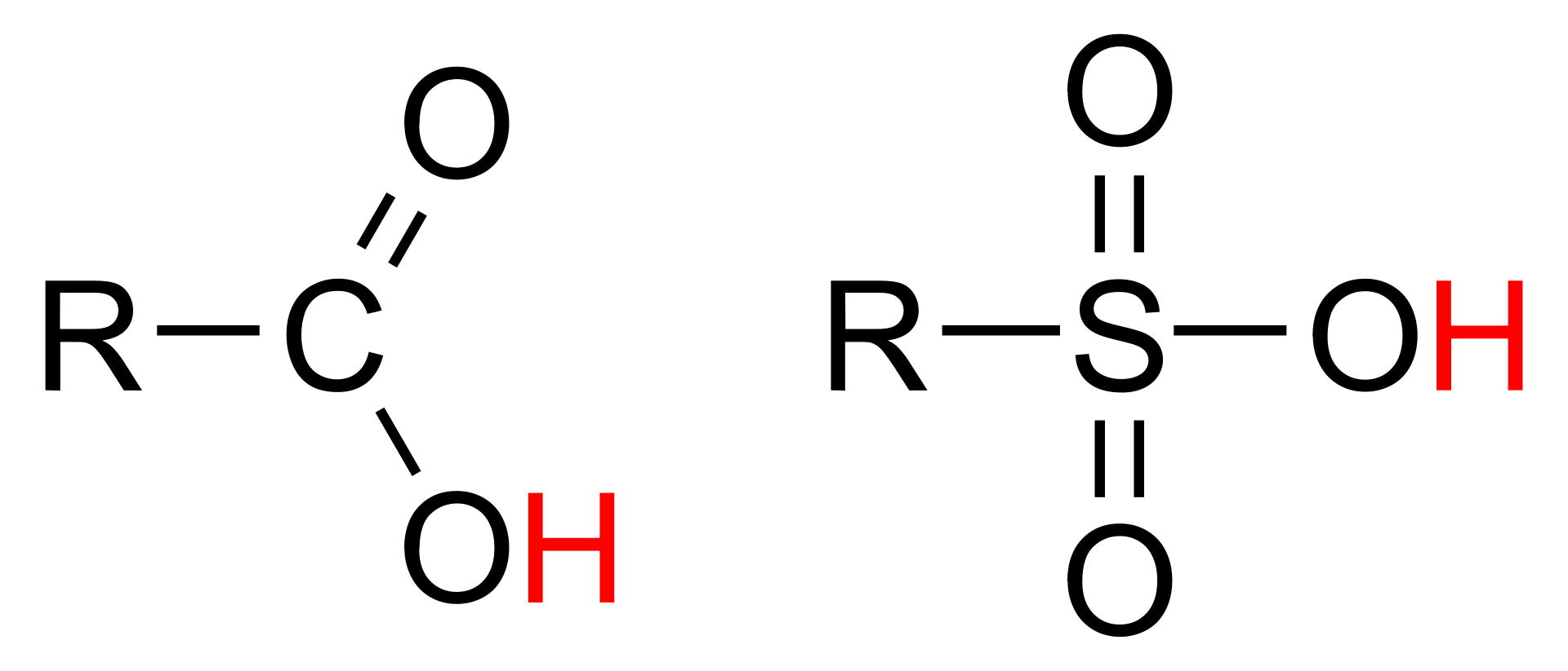 An organic acid is an organic compound with acidic properties. The most common organic acids are the carboxylic acids, whose acidity is associated with their carboxyl group –COOH. Sulfonic acids, containing the group –SO2OH, are relatively stronger acids. Alcohols, with –OH, can act as acids but they are usually very weak. The relative stability of the conjugate base of the acid determines its acidity. Other groups can also confer acidity, usually weakly: the thiol group –SH, the enol group, and the phenol group. In biological systems, organic compounds containing these groups are generally referred to as organic acids.