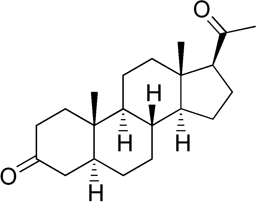 Three representations of an organic compound, 5α-Dihydroprogesterone (5α-DHP), a steroid hormone. For molecules showing color, the carbon atoms are in black, hydrogens in gray, and oxygens in red. In the line angle representation, carbon atoms are implied at every terminus of a line and vertex of multiple lines, and hydrogen atoms are implied to fill the remaining needed valences (up to 4).