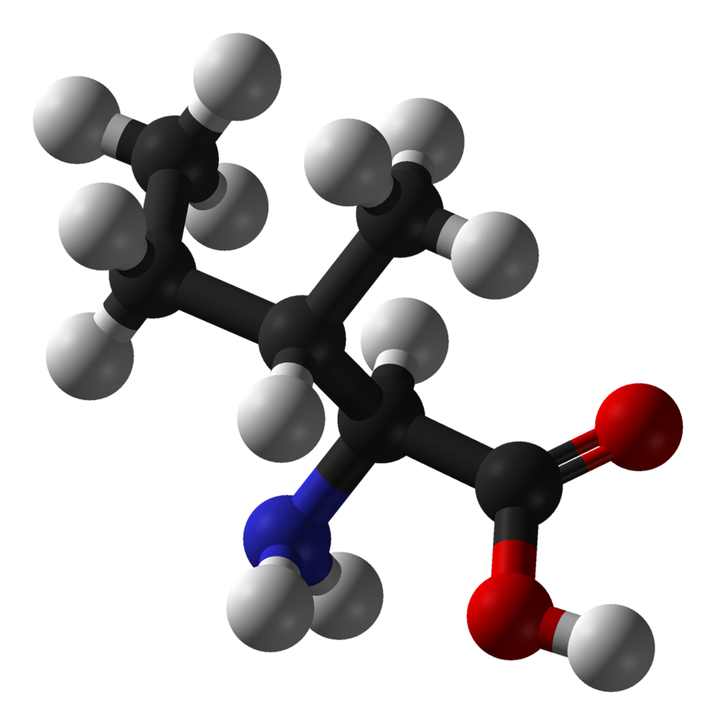 The L-isoleucine molecule, C6H13NO2, showing features typical of organic compounds. Carbon atoms are in black, hydrogens gray, oxygens red, and nitrogen blue.