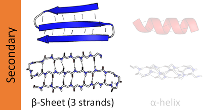 The β-sheet (also β-pleated sheet) is a common motif of regular secondary structure in proteins. Beta sheets consist of beta strands (also β-strand) connected laterally by at least two or three backbone hydrogen bonds, forming a generally twisted, pleated sheet. A β-strand is a stretch of polypeptide chain typically 3 to 10 amino acids long with backbone in an extended conformation. The supramolecular association of β-sheets has been implicated in formation of the protein aggregates and fibrils observed in many human diseases, notably the amyloidoses such as Alzheimer's disease.(W)