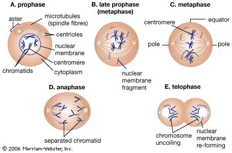 Stages of mitosis. A. Prophase. Replicated chromosomes, consisting of two daughter strands (chromatids) attached by a centromere, coil and contract. Two pairs of specialized organelles (centrioles) begin to move apart, forming a bridge of hollow protein cylinders known as microtubules (spindle fibres) between them. Microtubules also extend in a radial array (aster) from the centrioles to the poles of the cell. B. Late prophase. As the centrioles move apart, the nuclear membrane breaks down and microtubules extend from each centromere to opposite sides or poles of the cell. C. Metaphase. The centromeres align in a plane midway between the poles known as the equator, or metaphase plate. During late metaphase, each centromere divides into two, freeing sister chromatids from each other. D. Anaphase. Sister chromatids are drawn to opposite ends as centromeric microtubules shorten and polar microtubules lengthen, causing the poles to move farther apart. E. Telophase. Chromosomes uncoil, microtubules disappear, and the nuclear membrane re-forms around each set of daughter chromosomes. The cytoplasm begins to pinch in to create two daughter cells.