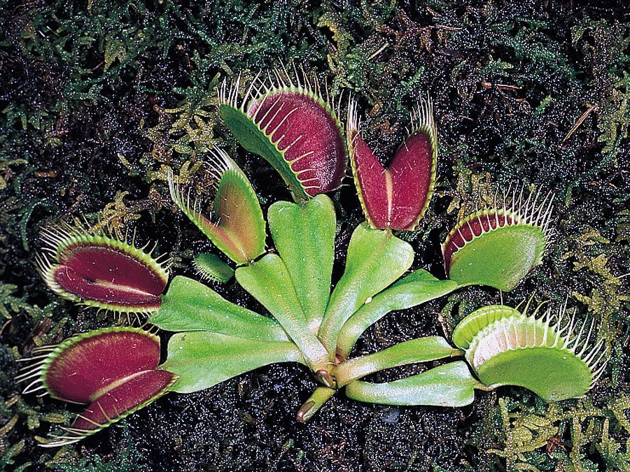 Active traps of the Venus's-flytrap (Dionaea muscipula), a carnivorous plant. If depressed at least twice, thin pressure-sensitive hairs in the trap stimulate the lobes to clamp tightly over an insect.