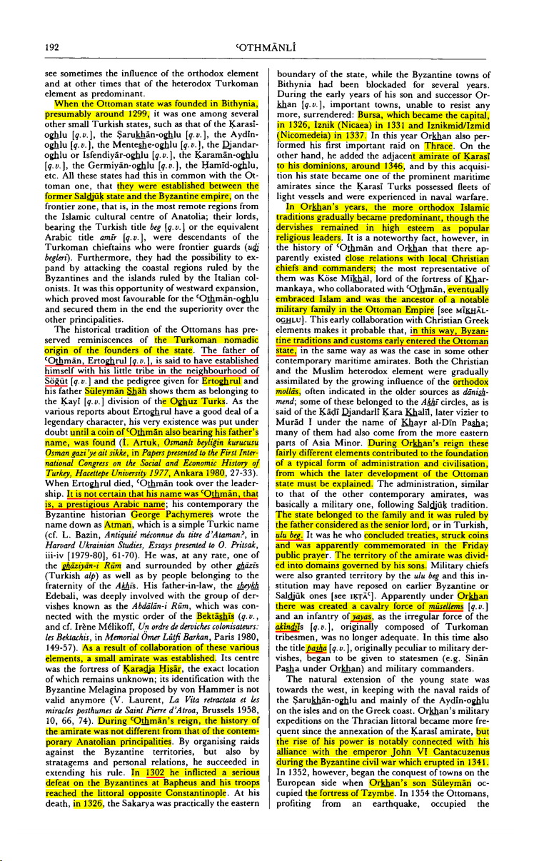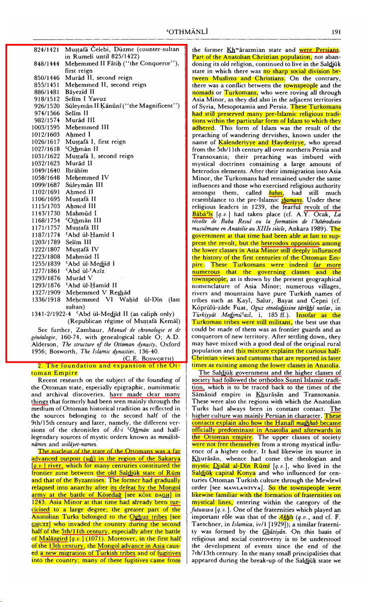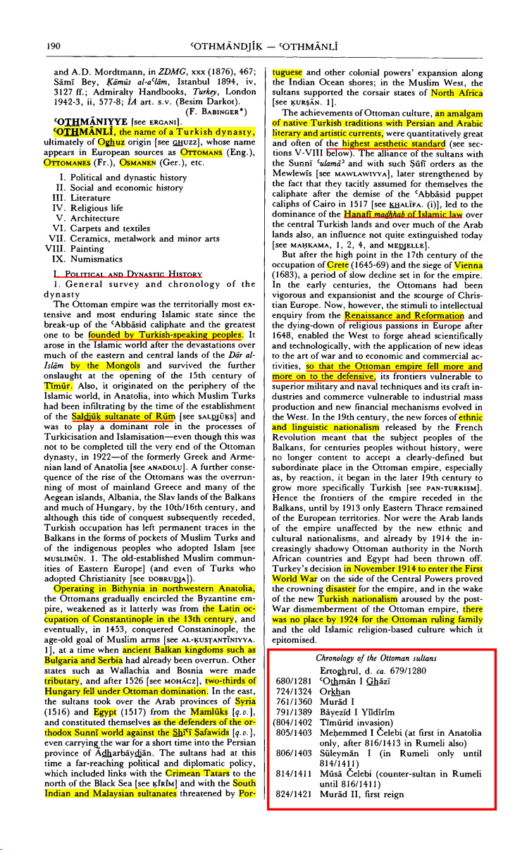 The most important and comprehensive reference tool for Islamic studies is the Encyclopaedia of Islam, an immense effort to deal with every aspect of Islamic civilization, conceived in the widest sense, from its origins down to the present day... EI is no anonymous digest of received wisdom. Most of the articles are signed, and while some are hardly more than dictionary entries, others are true research pieces – in many cases the best available treatment of their subject.[4]