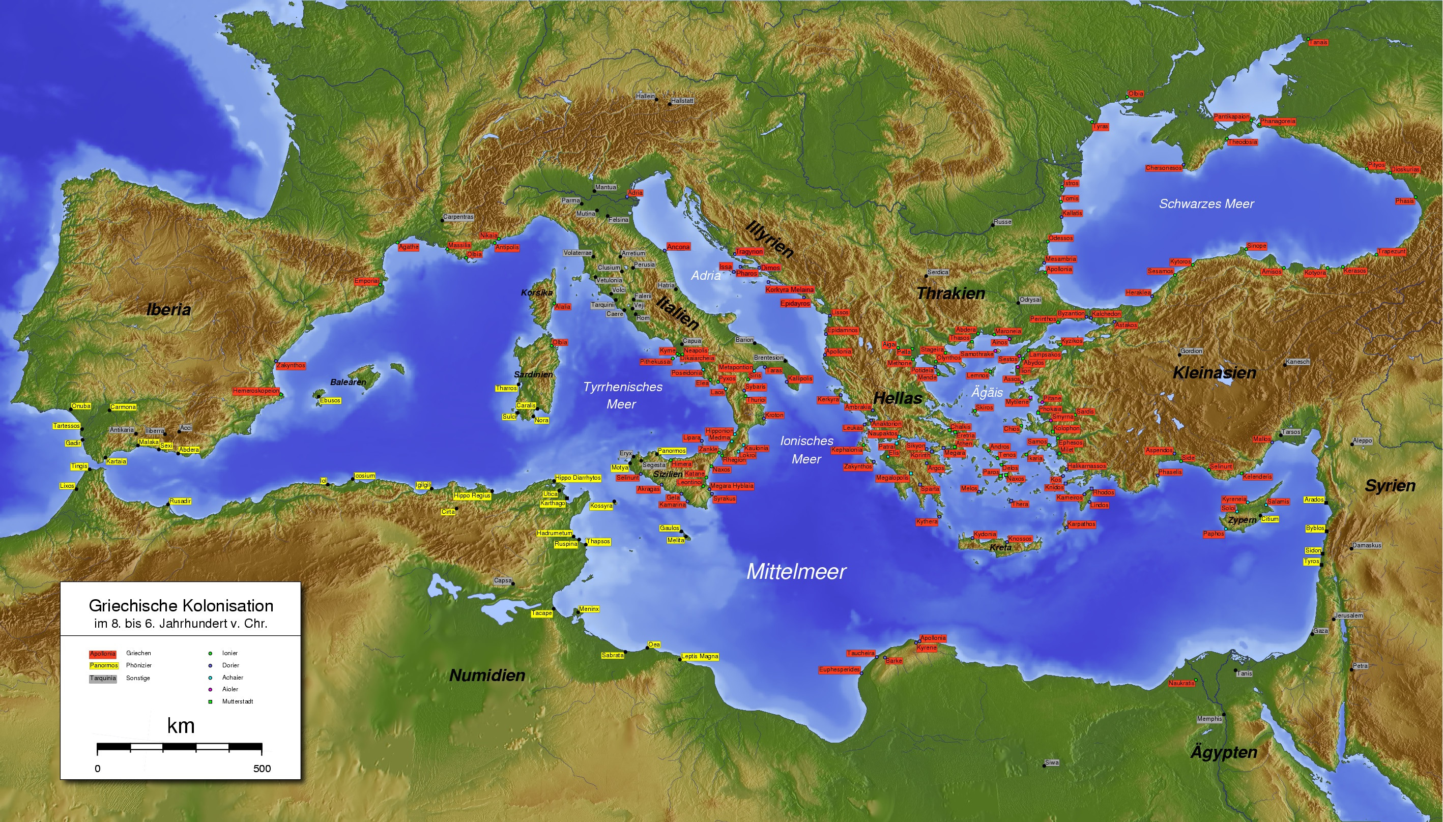 Phoenicia (from the Ancient Greek: Φοινίκη, Phoiníkē) was a thalassocratic, ancient Semitic-speaking Mediterranean civilization that originated in the Levant in the west of the Fertile Crescent. Scholars generally agree that it included the coastal areas of today's Lebanon, northern Israel and southern Syria reaching as far north as Arwad, but there is some dispute as to how far south it went, the furthest suggested area being Ashkelon. Its colonies later reached the Western Mediterranean, such as Cádiz in Spain and most notably Carthage in North Africa, and even the Atlantic Ocean. The civilization spread across the Mediterranean between 1500 BC and 300 BC.