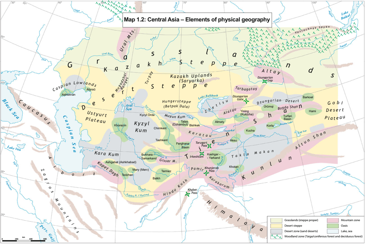 The history of Central Asia concerns the history of the various peoples that have inhabited Central Asia. The lifestyle of such people has been determined primarily {!} by the area's climate and geography. The aridity of the region makes agriculture difficult and distance from the sea cut it off from much trade. {!} Thus, few major cities developed in the region. Nomadic horse peoples of the steppe dominated the area for millennia.