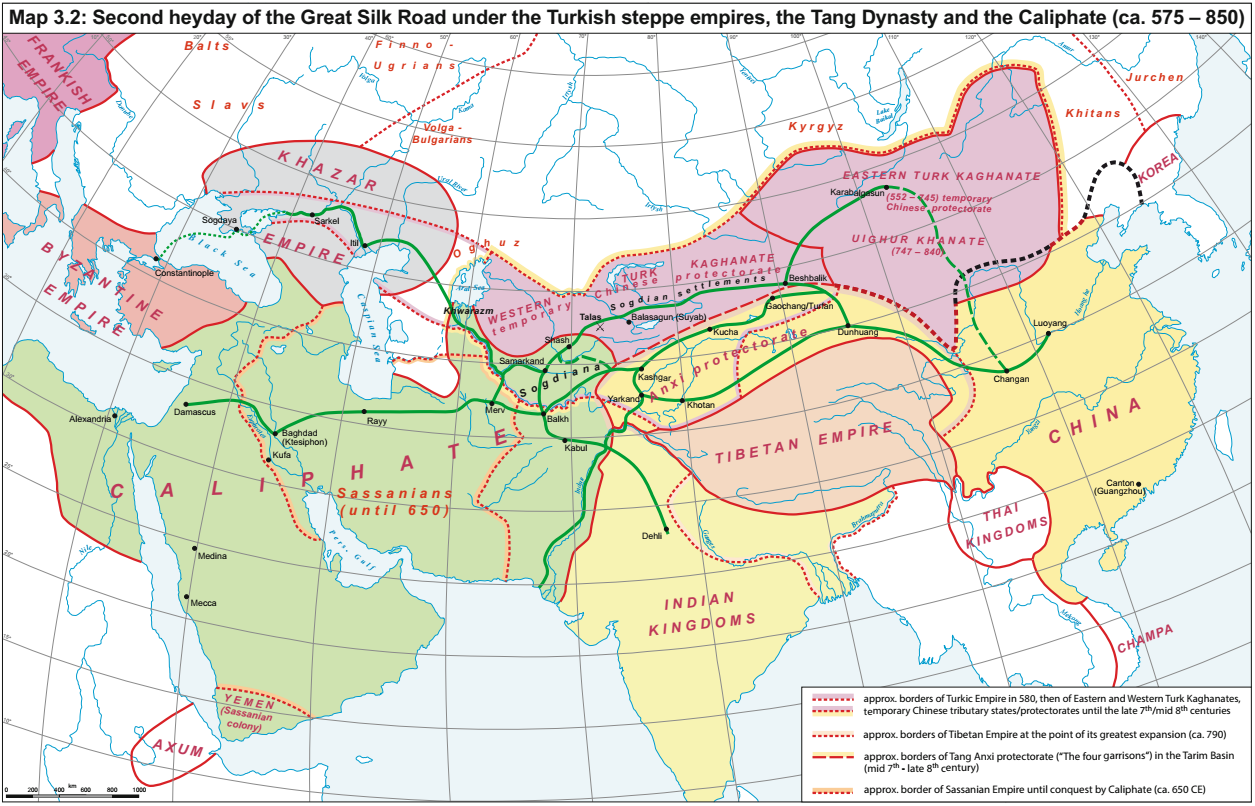 The main migration of Turkic peoples occurred between the 5th and 10th centuries, when they spread across most of Central Asia. The Tang Chinese were defeated by the Arabs at the battle of Talasin 751, marking the end of the Tang Dynasty’s western expansion.The Tibetan Empire would take the chance to rule portion of Central Asia along with South Asia. During the 13th and 14th centuries, the Mongols conquered and ruled the largest contiguous empire in recorded history. Most of Central Asia fell under the control of the Chagatai Khanate.