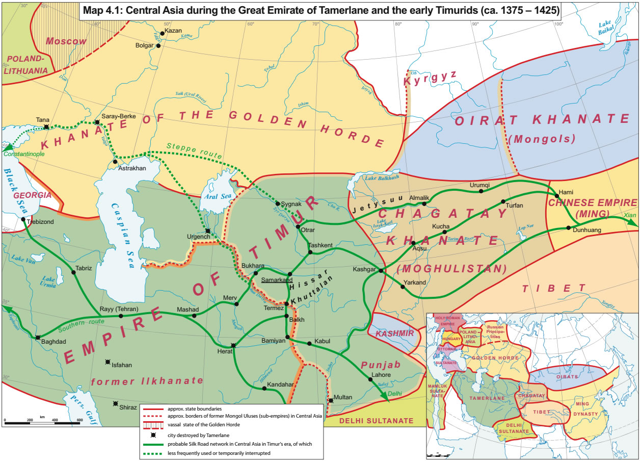 In the 14th century much of Central Asia, and many areas beyond it, were conquered by Timur (1336-1405) who is known in the west as Tamerlane. It was during Timur’s reign that the nomadic steppe culture of Central Asia fused with the settled culture of Iran. One of its consequences was an entirely new visual language that glorified Timur and subsequent Timurid rulers. This visual language was also used to articulate their commitment to Islam. Timur's large empire collapsed soon after his death, however. The region then became divided among a series of smaller Khanates, including the Khanate of Khiva, the Khanate of Bukhara, the Khanate of Kokand, and the Khanate of Kashgar.