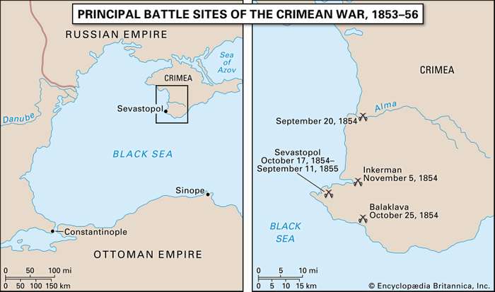 In September 1854 the allies landed troops in Russian Crimea, on the north shore of the Black Sea, and began a yearlong siege of the Russian fortress of Sevastopol. Major engagements were fought at the Alma River on September 20, at Balaklava on October 25 (commemorated in “The Charge of the Light Brigade” by English poet Alfred, Lord Tennyson), and at Inkerman on November 5. On January 26, 1855, Sardinia-Piedmont entered the war and sent 10,000 troops. Finally, on September 11, 1855, three days after a successful French assault on the Malakhov, a major strongpoint in the Russian defenses, the Russians blew up the forts, sank the ships, and evacuated Sevastopol. Secondary operations of the war were conducted in the Caucasus and in the Baltic Sea.