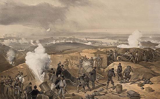 CrimeanSiege of Sevastopol — British forces firing upon Sevastopol, Russia; lithograph, 1855. Library of Congress, Washington, D.C.