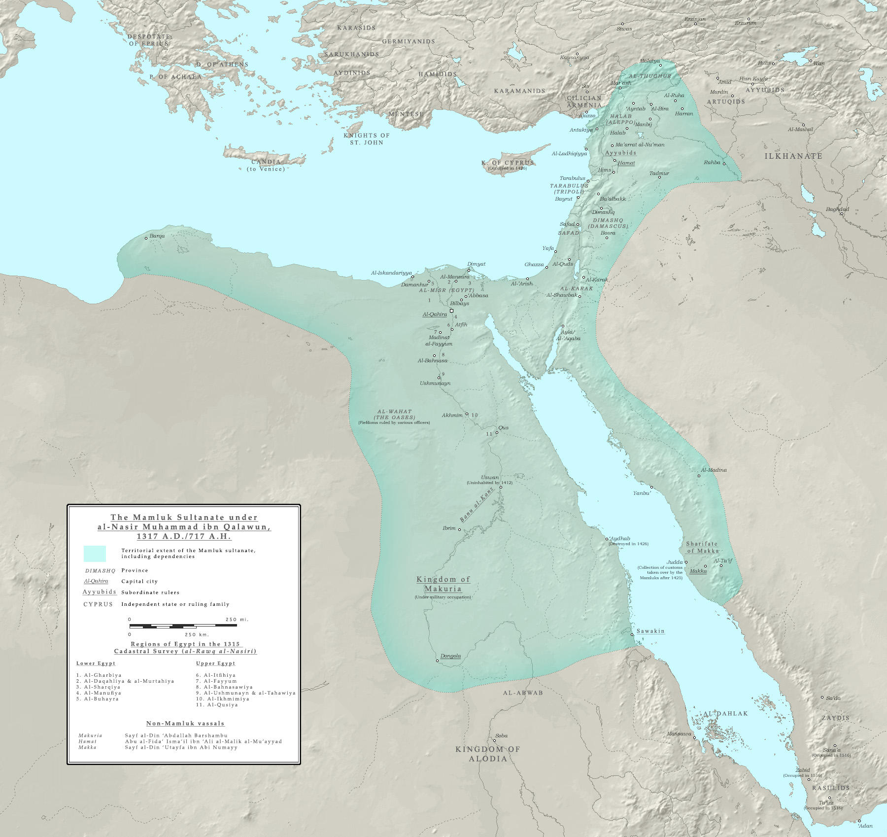 The Mamluk Sultanate (Arabic: سلطنة المماليك, romanized:Salṭanat al-Mamālīk) was a medieval realm spanning Egypt, the Levant, and Hejaz. It lasted from the overthrow of the Ayyubid dynasty until the Ottoman conquest of Egypt in 1517. Historians have traditionally broken the era of Mamlūk rule into two periods—one covering 1250-1382, the other, 1382–1517. Western historians call the former the “Baḥrī” period and the latter the “Burjī” due to the political dominance of the regimes known by these names during the respective eras. Contemporary Muslim historians refer to the same divisions as the “Turkic” and “Circassian” periods in order to stress the change in the ethnic origins of the majority of Mamlūks.