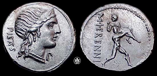 Pietas is first represented on Roman coins on denarii issued by Marcus Herennius in 108 or 107 BC.Pietas appears on the obverse as a divine personification, in bust form; the quality of pietas is represented by a son carrying his father on his back; the symbolism of which would be echoed in Virgil’s Aeneid, with Aeneas carrying his father Anchises out of the burning Troy. Pietas is among the virtues that appear frequently on Imperial coins, including those issued under Hadrian.