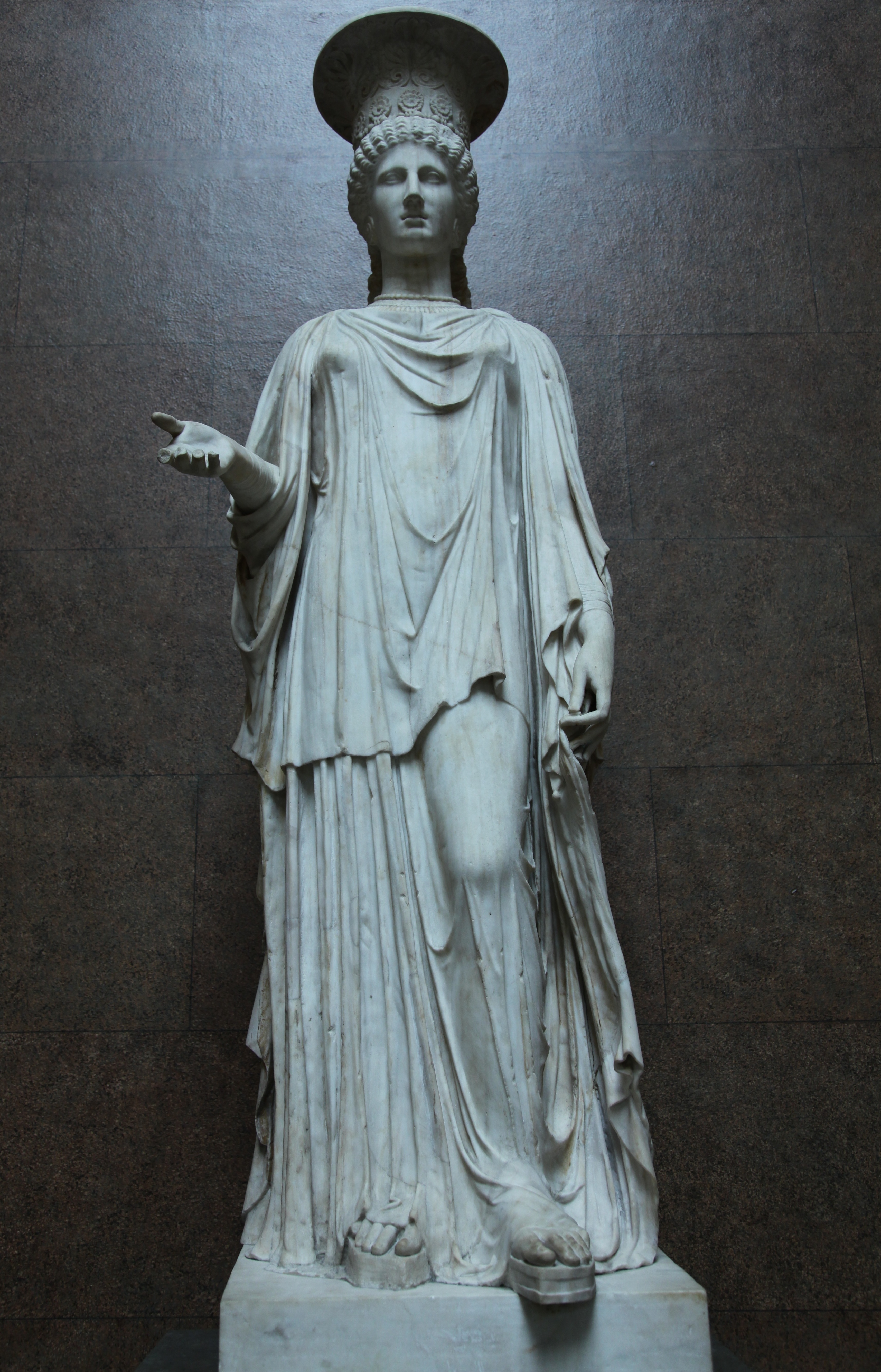 The Townley Caryatid is a 2.25m high Pentelic marblecaryatid, depicting a woman dressed to take part in religious rites (possibly fertility rites related to Demeter or Ceres, due to the cereal motifs on her modius headdress).